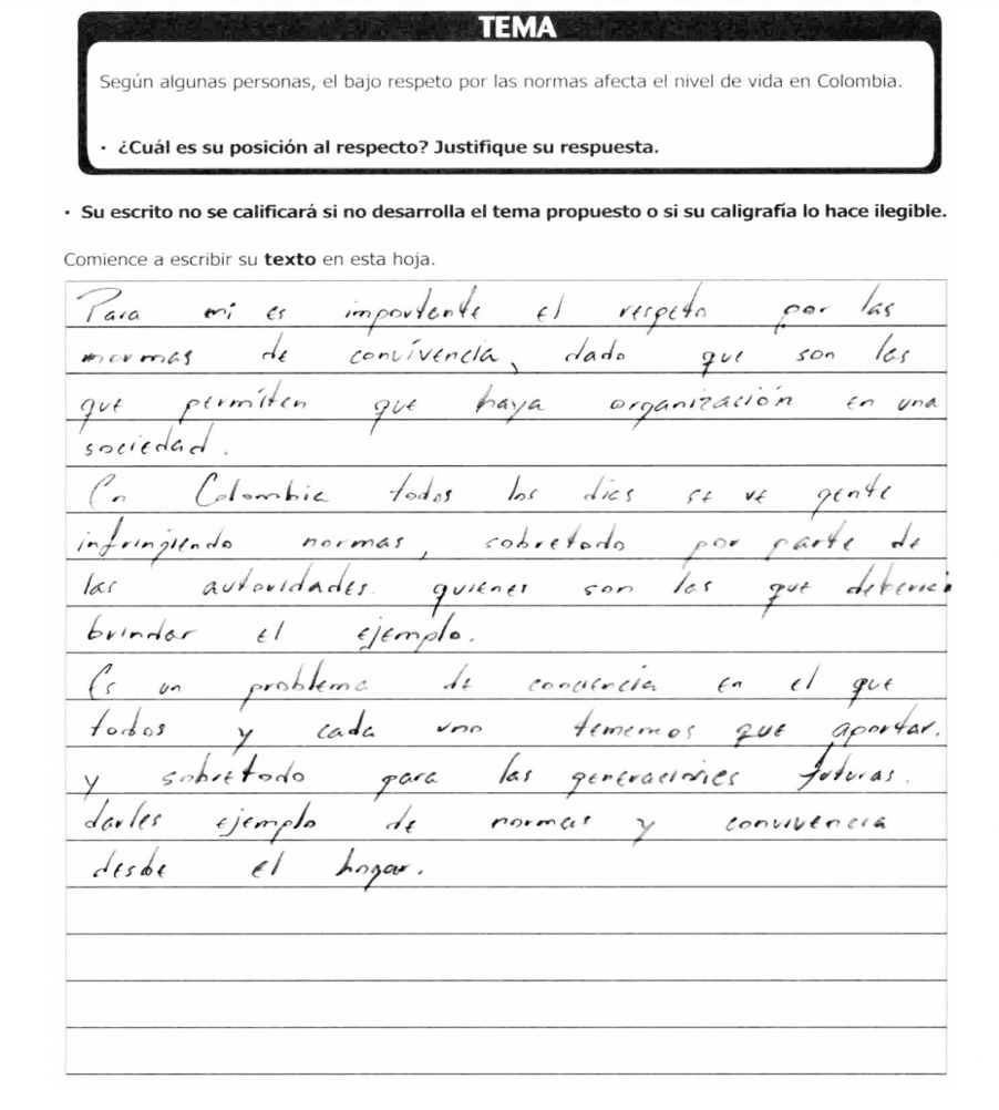 Acá resaltamos que el 18% de los estudiante en Colombia no llegan siquiera a un escrito como el de la imagen ejemplo y un 41% escribe con este nivel, algo insuficiente para un profesional.