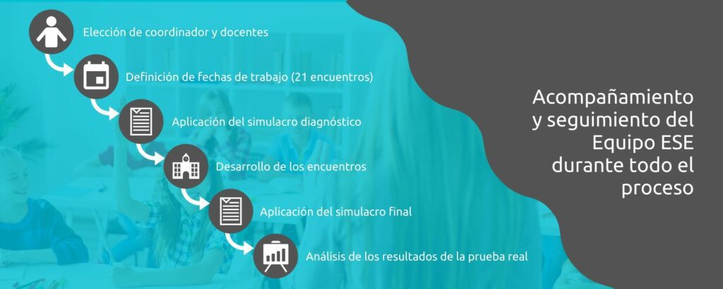 Los encuentros son apoyados con nuestro Libro Guía y la Escuela Virtual ESE. Además, realizamos simulacros virtuales de diagnóstico y finalización de la formación.